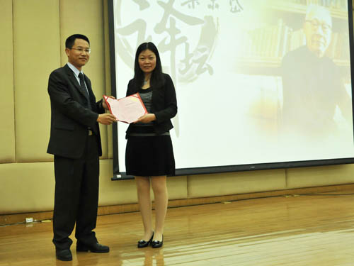 图书馆馆长为黄荭老师颁发了赠书荣誉证书
