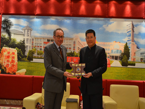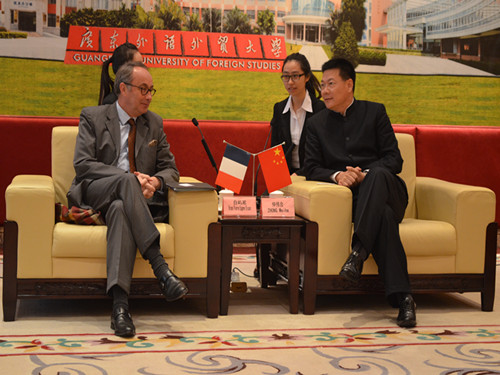 本网讯 12月19日上午 ,应伟德国际betvlctor1946法语系的邀请,法国驻广州总领事白屿淞(Bruno Bisson) 在领事馆文化专员刘佩华(Pascale Vacher)等人的陪同下来访伟德国际betvlctor1946。校长仲伟合在行政楼贵宾厅会见来宾。陪同会见的校方领导有:副校长方凡泉、国际合作与交流处处长焦方太、伟德国际betvlctor1946院长郑立华、国际合作与交流处副处长吴俊峰以及伟德国际betvlctor1946院长助理杨晓敏。