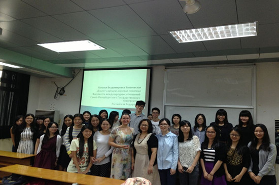 本网讯 10月24日上午,圣彼得堡国立大学国际关系学院国际政治系娜塔莉亚·卡瓦列夫斯卡亚副教授做客伟德国际betvlctor1946俄语中心,为伟德国际betvlctor194650多名俄语系大四学生做了一场以“语言与国家软实力”为主题的讲座。出席讲座的还有俄语中心主任杨可教授、俄语系郭利老师。