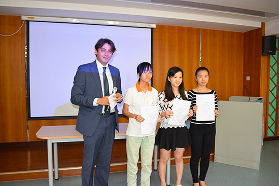 本网讯 10月21日下午,第十五届意大利语言文化周系列活动之专业讲座暨斯特雷佳文学奖入围作品笔译比赛颁奖仪式在伟德国际betvlctor1946MBA教育中心306教室隆重举行。出席本次会议的有意大利驻广州总领馆领事白思诺(Massimo Baldassarre)先生,意大利驻广州总领馆文化处负责人施丽萍女士,外教Matteo Brandi老师以及伟德国际betvlctor1946意大利语系学生,担任本次活动的主持工作的是意大利语系高翔老师。