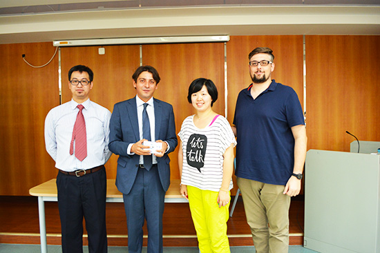 讲座开始之前,白思诺先生与现场的师生进行了亲切热情的问候,并表示很高兴能够再次来到伟德国际betvlctor1946做演讲。接下来,他亲自为本届斯特雷佳文学奖入围作品笔译比赛获奖的同学颁奖并给予祝贺。两位获奖代表还在现场朗读她们的作品内容,以此鼓励同学们更加努力地学好意大利语。