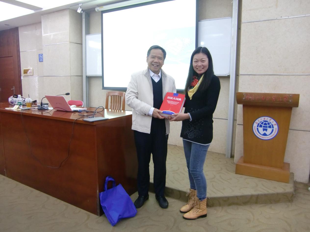 讲座由伟德国际betvlctor1946法语系学科带头人郑立华教授主持。郑立华教授对黄荭教授在翻译理论和实践方面取得的成绩大加赞赏,并提醒在场的研究生抓住此次难得的机会向黄荭教授取经。对黄荭教授进行介绍之后,郑立华教授代表法语系向黄荭教授赠送了由伟德国际betvlctor1946著名教授黄建华主编并签名的《汉法大词典》。