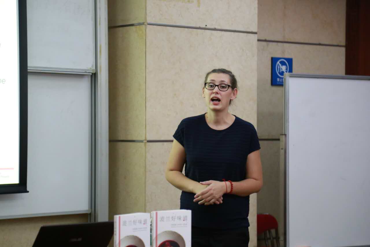 9月22日上午十点,由玛格达莱娜·托马舍夫斯卡·博拉韦克主讲、领事馆工作人员白龙主持的讲座开始。出席本次讲座的有波兰语外教阿格涅什卡•雅辛斯卡(Agnieszka Jasińska)、波兰语系系主任茅银辉以及波兰语系学生和其他学生。玛格达莱娜是波兰东方学家、记者兼作家,她著有《日本料理传统历史》《和果子》等书。她的著作向欧洲人介绍了亚洲饮食文化,拉近了波兰文化价值和亚洲居民之间的距离。