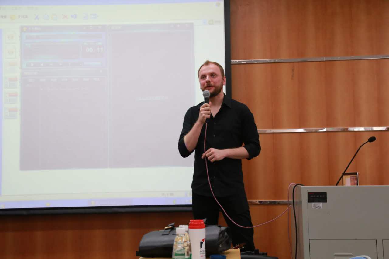 首先,总领事助理白龙主持介绍了拉法乌·萨尔奈茨基的大概情况。拉法乌·萨尔奈茨基是当红的活跃在纽约现代爵士乐舞台上的波兰裔优秀吉他手兼作曲家,其独特的现代爵士作品使之成为年轻一代爵士乐手中的佼佼者。接着,拉法乌为大家介绍了爵士的起源,以及爵士传入波兰后在波兰的发展过程。随后,他又介绍了传统波兰爵士和现代波兰爵士的一些代表性作曲家。为帮助同学们更好地理解传统波兰爵士和现代波兰爵士,他不仅播放了相应的具代表性的音乐,而且还现场演奏吉他。