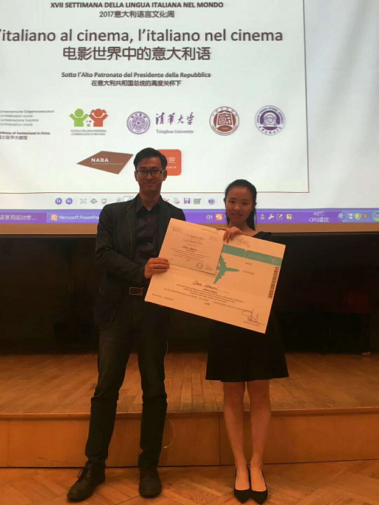 比赛分为才艺表演和知识问答两个环节。在第一个环节中,陈婉霓同学围绕中意文化交流这一主旨,结合主持、歌唱等表演形式,穿插引用耳熟能详的中意歌曲和意大利经典电影片段,引发评委和观众共鸣,暗合本届意大利语言文化周主题——“电影中的意大利语”。10分钟的精彩表演收获阵阵掌声,得到在场评委观众的喜爱和好评。在第二个环节中,陈婉霓同学准备充分、从容应对,展现了良好的知识储备和语言综合应用能力。综合两个环节,陈婉霓同学最终以发音与语言流畅度单项和总分均第一的成绩脱颖而出摘得桂冠,并且获得最佳发音奖。