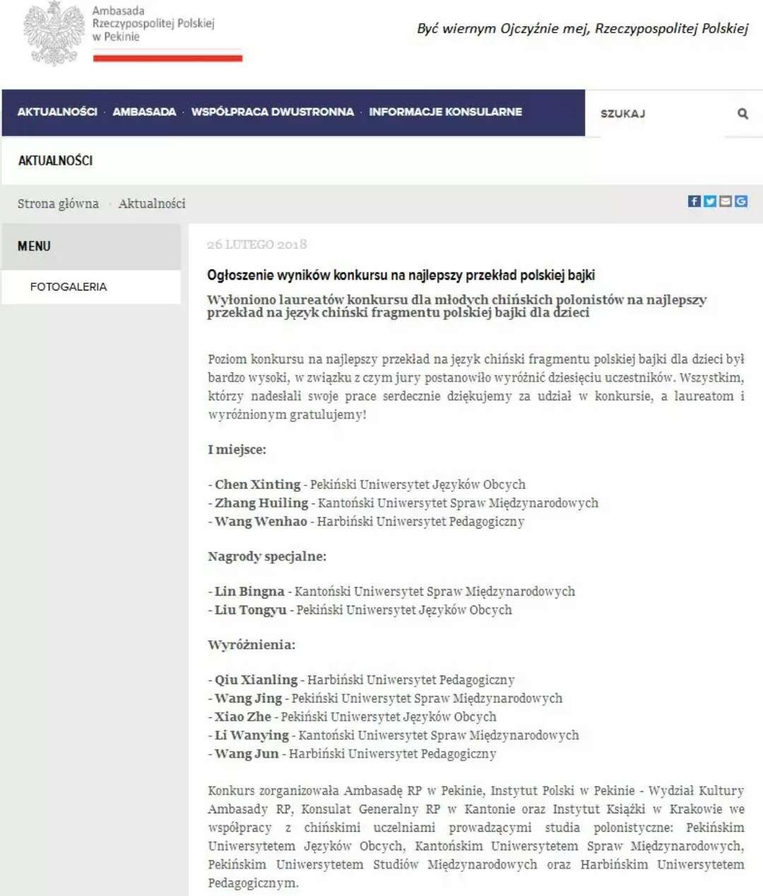 波兰共和国驻华大使馆在官网公示的获奖名单
