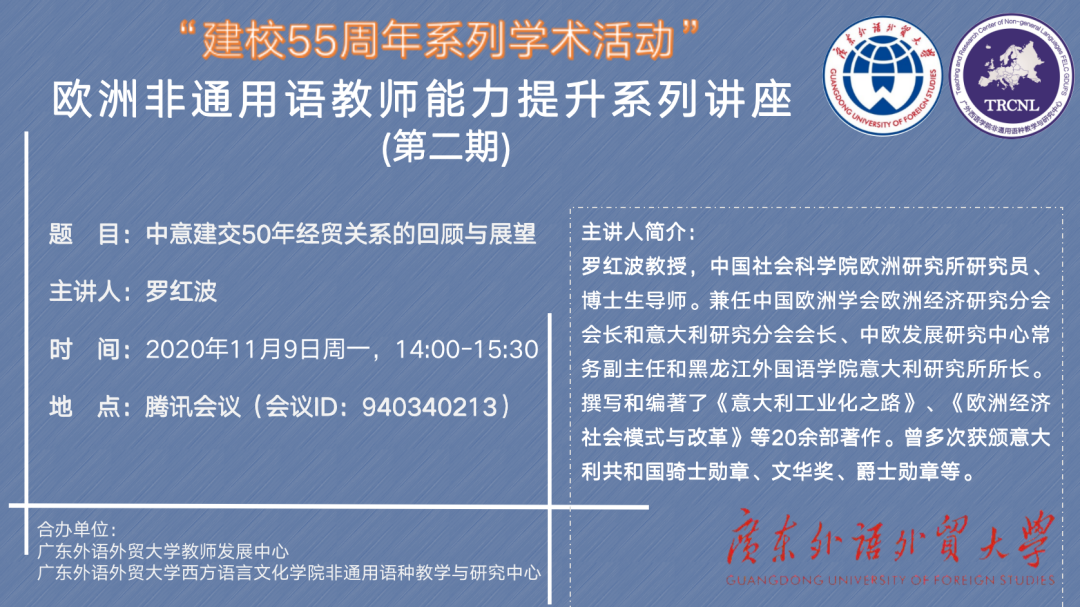 本网讯 2020年11月9日下午,中国社会科学院欧洲研究所研究员、博士生导师罗红波老师为伟德国际betvlctor1946意大利语系师生带来了一场精彩的线上讲座。本次讲座的主题是:中意建交50年经贸关系的回顾与展望。