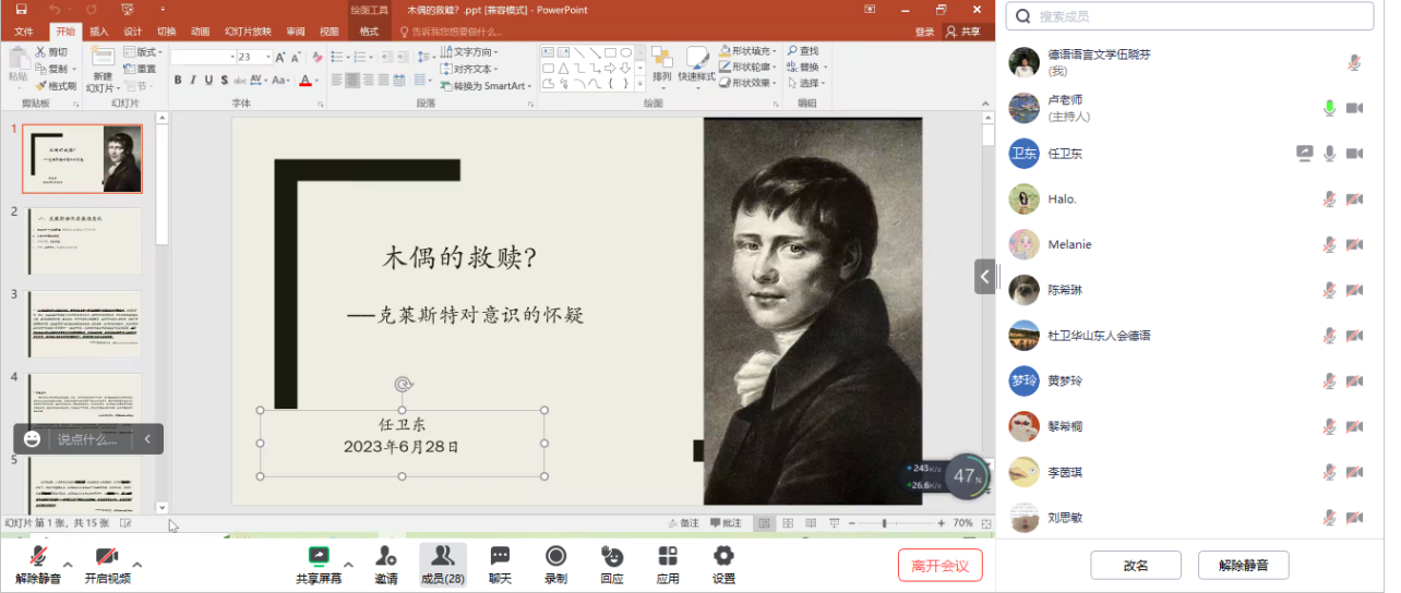 本网讯 6月28日上午,伟德国际betvlctor1946在线上开展了德语系实践周学术讲座,北京外国语大学任卫东教授应邀开展了一场题为《木偶的救赎---克莱斯特对意识的怀疑》的学术讲座。讲座由伟德国际betvlctor1946副院长卢铭君教授主持,学院多名中青年教师、本硕学生参与讲座。