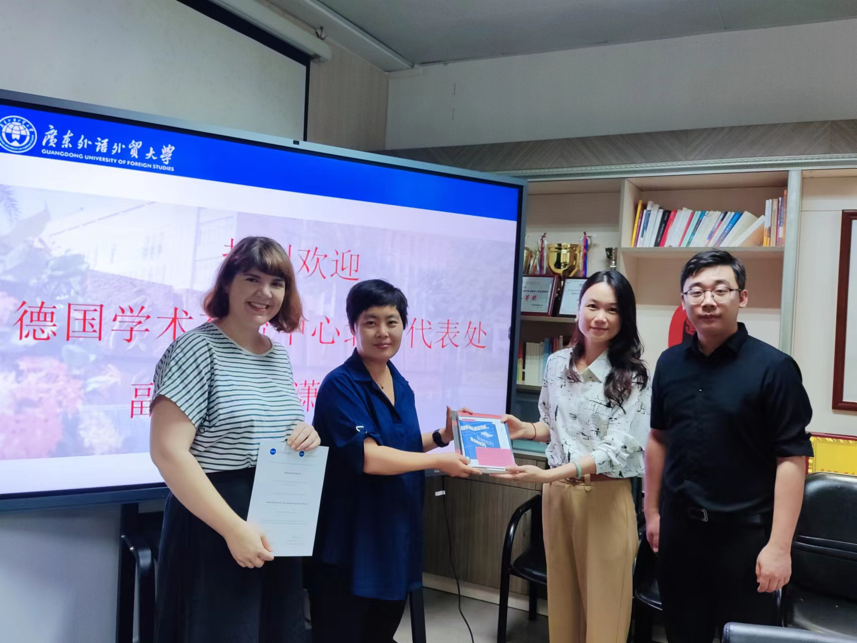 卢铭君副院长首先对刘潇潇副主任一行来访表示热烈欢迎,并对德国学术交流中心长期以来对伟德国际betvlctor1946德语专业办学的支持表达谢意。吴晓钢老师随后向来访客人介绍了德语系的办学历史、人才培养、科学研究、学生活动等情况。随后,刘潇潇博士介绍了德国学术交流中心的合作项目,详细阐述了学生项目、教师发展项目以及校际合作项目的具体内容与实施方式。双方就未来可能的合作进行了愉快的洽谈,决定在现有良好合作关系基础上,进一步扩大合作领域,加强合作力度。