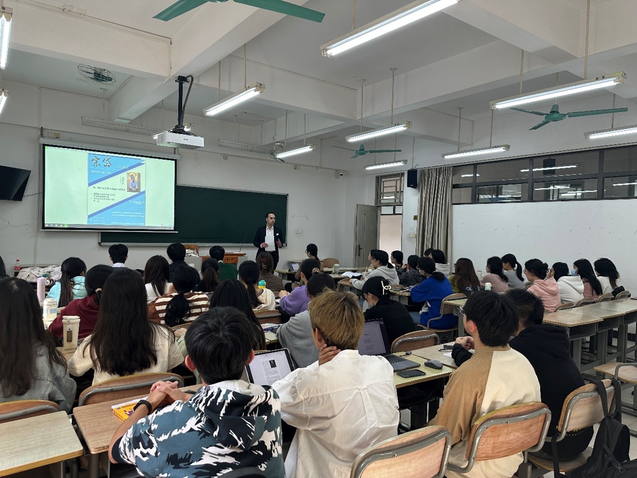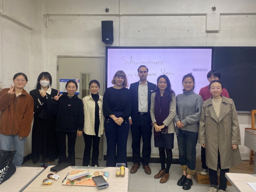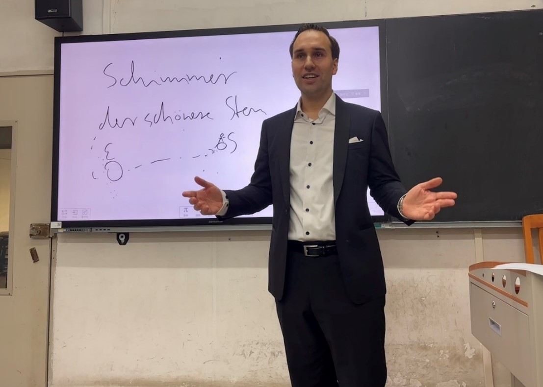 本网讯 2023年12月5日上午, 德国慕尼黑大学语文学系、哲学系助理研究员、清华大学“水木学者”Dr. Michael Schwingenschlögl为伟德国际betvlctor194623级德语专业学硕班学生围绕启蒙运动思潮和诗歌中的宇宙观举办了一场别开生面的工作坊。此次分享会由德语系卢铭君教授组织,DAAD的Katharina Eberle女士主持。