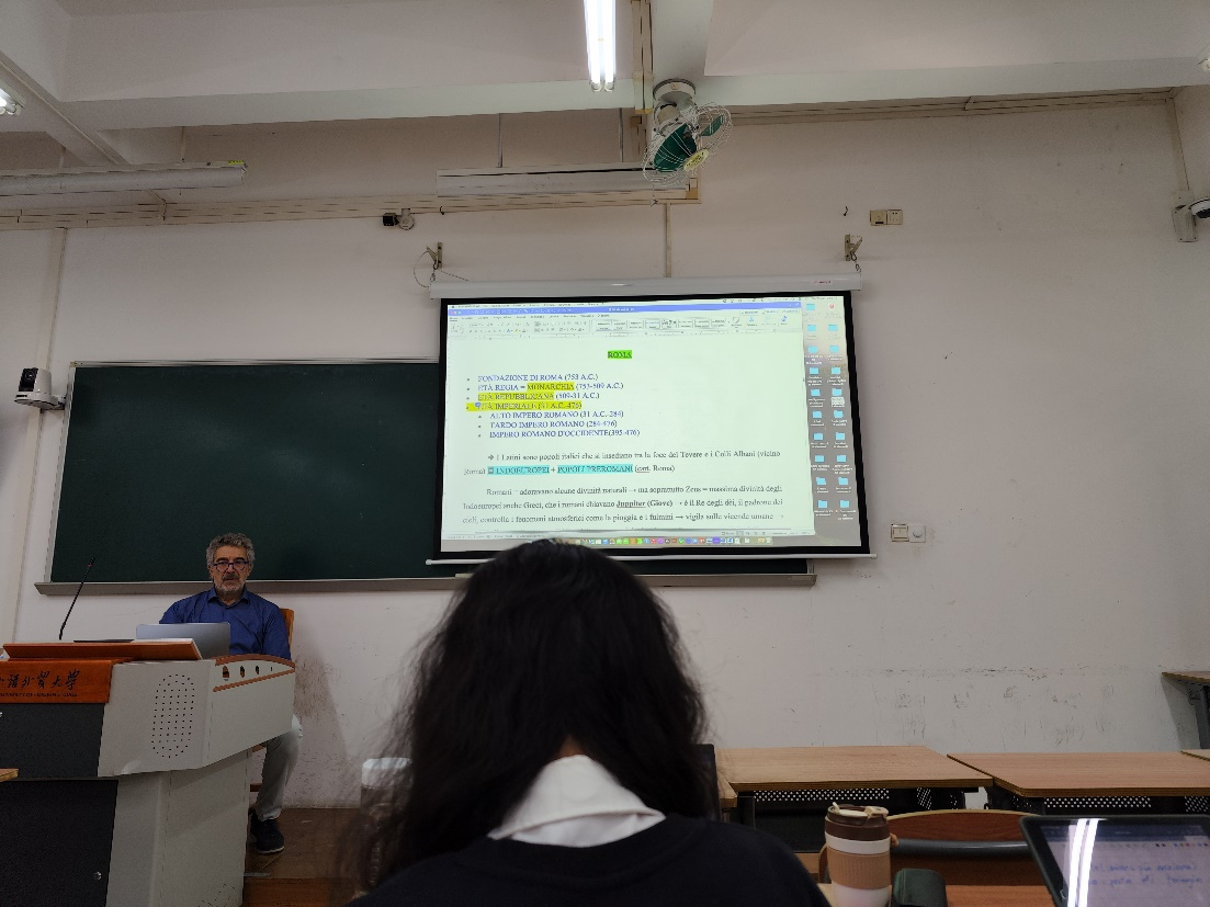 Vetrone教授给大四的学子教授了中世纪史。教授先是为同学们简单介绍了意大利的地理环境及概况。教授告诉意语学子中世纪分为两个部分,即l’alto medioevo和il basso medioevo。
