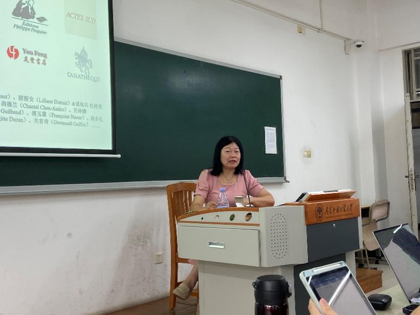 最后,黄教授讲述了中国作家在法国译介的主要推手,包括中国政府、书展、作协、研讨会、法国译者和一些主要汉学家(何碧玉,安毕诺,杜特莱,巴彦,居里安,贝施娜,杜碧姬,金卉,关首奇)、法国出版社(毕基耶、中国蓝、伽利玛)、南方书编、书店、文学沙龙、学术研讨会……在此期间,黄教授还向大家简单介绍了法国汉学家以及中国作品的主要法国出版社。