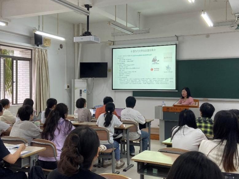 随后,黄教授向同学们介绍了在法国译介最多的中国当代作家,其中包括莫言,苏童,余华,毕飞宇,阎连科。黄教授提到一些中国作家作品走向国际的成功离不开中国当代文学译介的大背景,比如:出版社的大力推动、翻译的助力传播、图书沙龙促进交流、电影改编扩大影响、以及文化政策的扶持。同时也点出了中国文学走出去存在的问题,比如:法国文学界对中国文学作品的关注不足、有关中国文学作品的法国研究论文较少、法国书商对知名作家标签化、法国读者过度聚焦中国的社会历史。