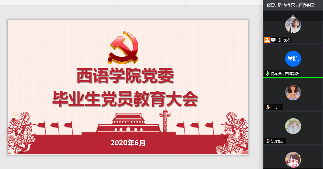 为进一步加强毕业生党员教育,全面提高毕业生党员党性意识和组织观念,充分发挥毕业生党员的先锋模范作用,6月6日下午,伟德国际betvlctor1946召开毕业生党员线上教育大会。院党委副书记陈华荣,辅导员张悦欢、倪娉婷,40多名毕业生党员同志参加会议。