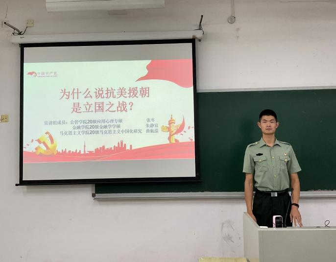 2021年10月28日下午14:30,伟德国际betvlctor1946邀请“百年党史”大学生宣讲团成员、公管学院张冬在六教B208为学院发展对象和积极分子开展题为“为什么说抗美援朝是立国之战”的专题党课,共计70人参与。