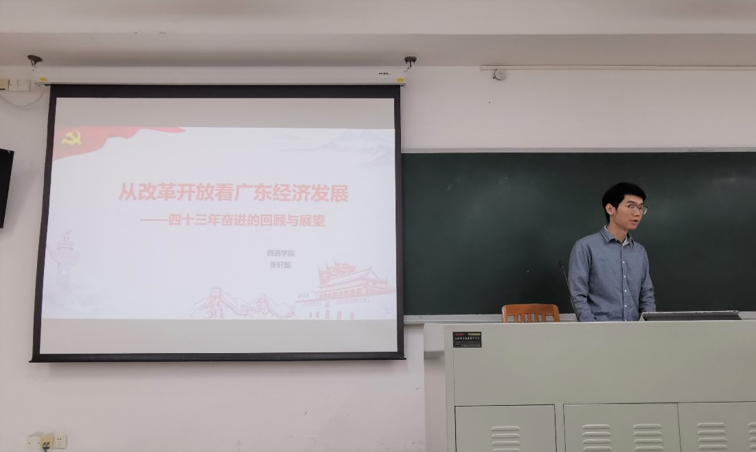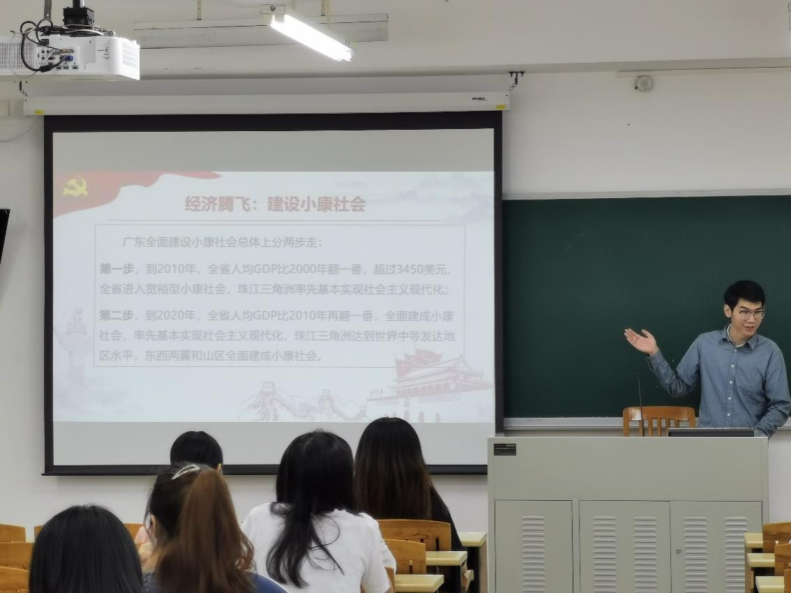 张轩甄以时间为轴,分别讲述了广东在1978年至1992年开拓改革开放试验田、1993年至2012年迈向改革开放深水区、2012年至今走上全面改革开放新征程的背景、政策和成就,带领同学们回顾与展望了广东经济腾飞的轨迹与社会主义市场经济体制的确立、“追龙”战略、“一带一路”建设、粤港澳大湾区等43年奋进历程。