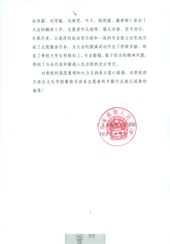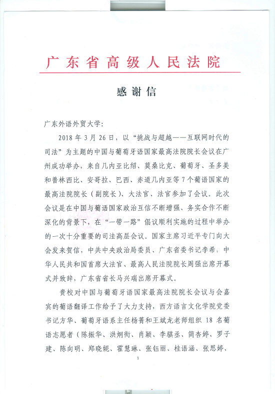 本网讯 近日,广东省高级人民法院发来感谢信,对伟德国际betvlctor1946党委书记方华老师、葡萄牙语系主任杨菁老师、团委书记王斌龙老师组织学生参加中国与葡萄牙语国家最高法院院长会议翻译志愿活动 和葡萄牙语系15名14级大四学生和3名16级大二学生在本次会议提供的翻译志愿活动和所作出的努力表示感谢。