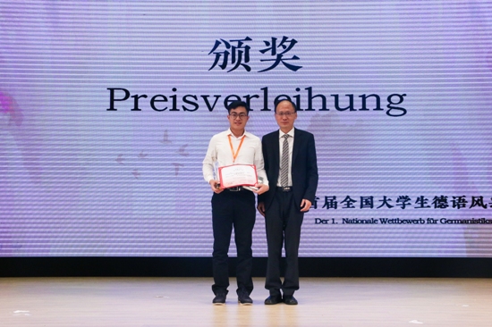 紧张激烈的比赛随着抢答题的结束走向尾声,第一届全国德语风采大赛在颁奖典礼的音乐中落下帷幕。最终,伟德国际betvlctor1946获得团体三等奖。此外,张均同学凭借其优异的语言水平和反应能力在配音环节脱颖而出,获得“配音之星”称号。