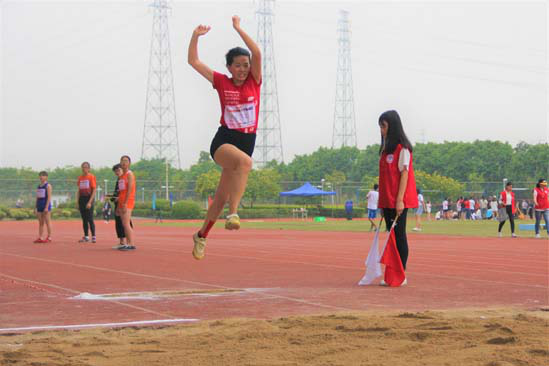 11月17日下午进行的是女子五项全能之二跳远比赛。张莉同学在赛场上用力一跃,在空中划出一道优美的弧线后稳稳地落在沙池中,引来观众的阵阵赞叹。