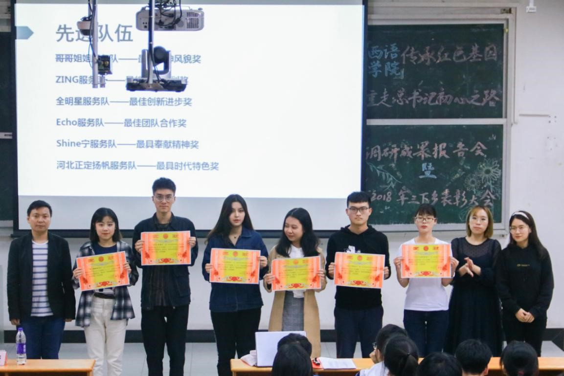 在播放完“三下乡”精美的回顾视频之后,六支“三下乡”队伍:河北正定扬帆服务队、哥哥姐姐服务队、ING服务队、全明星服务队、Echo服务队及Shine宁服务队的队长分别为大家进行了“三下乡”前期准备工作的介绍及成果展示。河北正定扬帆服务队“传承红色基因,重走总书记初心之路”,Shine宁服务队深入基层宣传“国家助学金”。其余四支支教队伍根据自身的特点并针对义教学校情况,为乡村的孩子们设计了一系列精品课程。