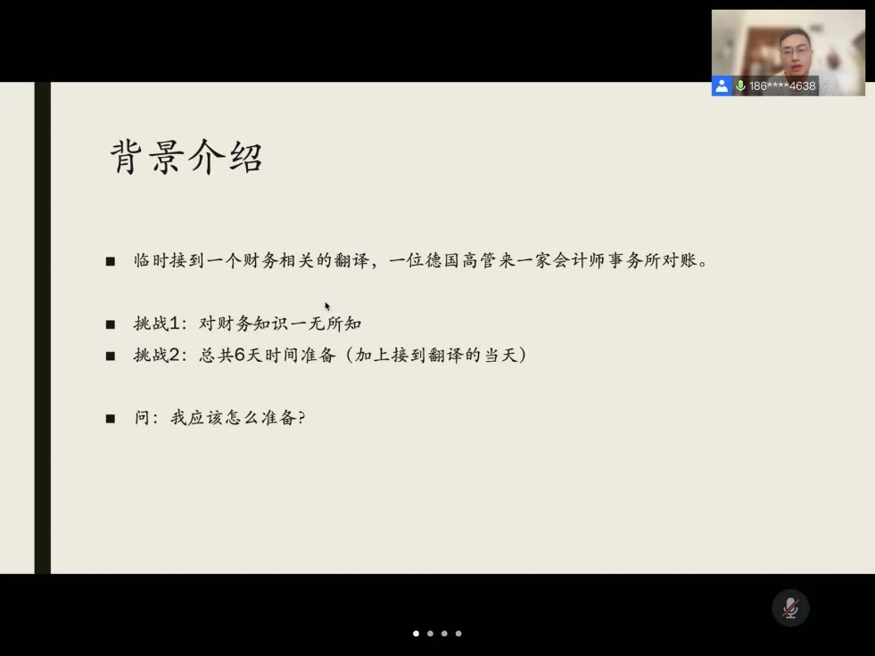 准备工作主要分为三个部分,首先是与需求方的重要沟通,理清楚双方的观点和现实情况,拿到与任务相关的信息表格和基础材料。有条件的话最好与双方当事人进行有效沟通,这样可以提前把握情况。然后是对基础知识的补充,阅读资料和相关的审计报告以及报表等,对德国版本的词汇也进行了解,初步体会表格之间的联系,以及表格的项目与公司情况之间的反映和其中的联系。接下来是个人口译的练习部分,通过网页视频的观看和背诵双语报表,以及口译中实体感觉的回忆,然后是自己对照报表练习用德语对其进行相关的描述。张均学长还跟同学们分享了他具体的翻译过程。