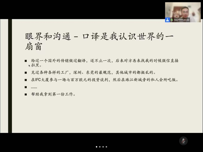 张均学长也提到,眼界和沟通能力作为一名译者的重要品质和能力,口译是他认识世界的一扇窗户,透过这扇窗他认识到不同的人,也在不同的场合得到了许多收获,并帮助他拿到了第一份工作。对口译有兴趣的同学,可以从兼职做起,积累相关的经验和人脉,同时,还要有很强的实时间管理能力和自我驱动力。