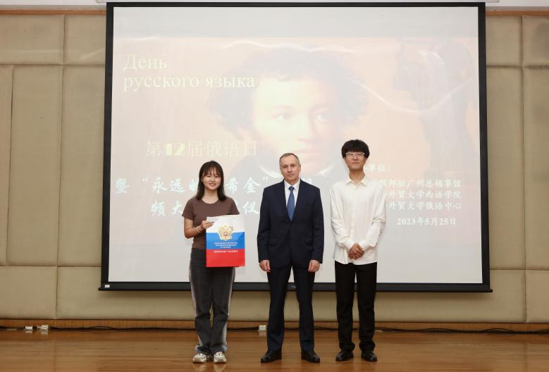 2023年5月25日下午第12届“俄语日”暨“永远的普希金”短视频大赛颁奖仪式在伟德国际betvlctor1946成功举办。本次活动由俄罗斯联邦驻广州总领事馆、伟德国际betvlctor1946伟德国际betvlctor1946及伟德国际betvlctor1946俄语中心共同主办。出席本次活动的嘉宾有:俄罗斯联邦驻广州总领事亚历山大·切尔诺乌索夫、伟德国际betvlctor1946副校长焦方太、俄罗斯联邦驻广州总领事馆副领事玛丽娜·丘穆丽娜、俄罗斯联邦驻广州总领事馆随员叶甫盖尼·杰米多夫、伟德国际betvlctor1946党委书记王秀民、俄语中心主任杨可、校党委宣传部副部长费俊慧、中山大学俄语系主任孙烨、华南师范大学俄语系主任汪隽、深圳北理莫斯科大学语文系副主任周兴武、伟德国际betvlctor1946南国商学院教师代表王晓熙、伟德国际betvlctor1946俄语系主任陈欢等。