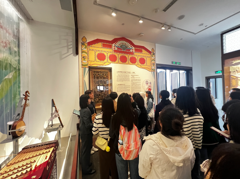 广州作为历史文化名城之一,孕育了丰富多彩的非物质文化遗产。在讲解员的带领下,学生们参观了文化馆中心阁的“广州非物质文化遗产展”,其包含了“粤韵流芳”“食在广州”“岁时节庆”“医养岭南”“南拳强身”“广作华彩”“羊城古仔”七个部分,深入了解了岭南文化精粹和人文特质。