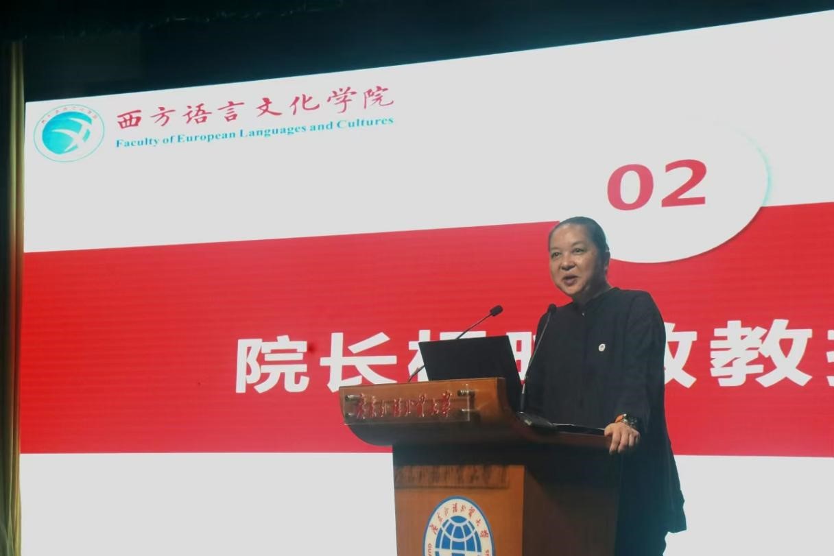 开学典礼在庄严的国歌声中拉开序幕。院长杨晓敏教授首先致辞,她以风趣幽默的口吻向新生详细介绍了伟德国际betvlctor1946的发展历程、学科特点和人才培养目标,分享了属于西语的几个“广外之最”:广外历史最悠久文化学术底蕴最为深厚的学院之一、广外专业最多的学院、以及广外硕士点、博士点最多的学院,并鼓励全体新生“好好成长、好好学习、好好生活”,成为大写的人、优秀的人、幸福的人。杨院长还现场演唱粤语歌《朋友》,对学生表示欢迎,并祝愿全体新生在广外书写绚丽的青春华章。