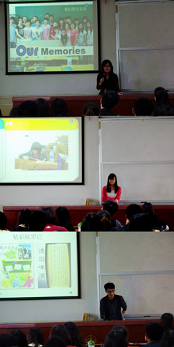 09西B更是独具匠心,以巡回式的讲演,幽默的解说,让大家既轻松又印象深刻。西B的团委说,虽然班上没获过什么大奖,但有潜力才有未来,他们的未来一定不是梦。西语大家庭,每个班都是潜力股,他们活跃,他们积极向上。他们刚起航,却朝气蓬勃。