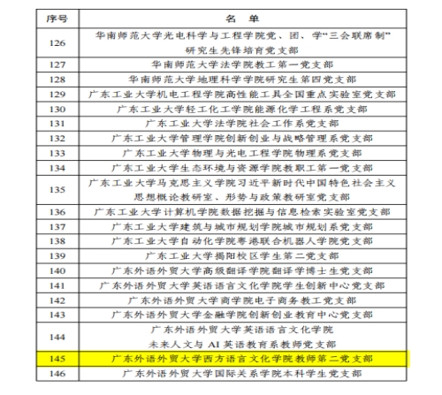 近日,中共广东省委教育工委公布第五批全省党建工作示范高校、标杆院系、样板支部培育创建单位名单,西方语言文化学院教师第二党支部入选全省党建工作样板支部培育创建单位