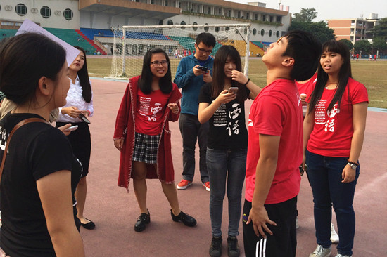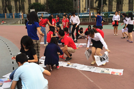 在各部长发言结束后,全团大会进入到了高潮部分——游戏环节。所有团学成员被随机分成13个小组,每组由一名部长担任组长,到田径场进行趣味接力游戏。面对彼此并不熟悉的组员们,团学成员们克服尴尬,团结一致地完成了趣味接力游戏的比赛。在游戏的过程中,成员之间的了解程度进一步加深,也体现了西语人友爱团结的精神。
