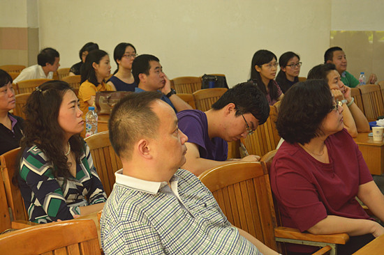 在杨可院长简单的开场白后,郑立华教授直奔主题,简单概括了小语种专业教师的科研之路。接着,他提出了教师们在现阶段面临的主要问题:教学与科研间的冲突、教师生活压力大、科研体制不合理和小语种论文发表途径小。他也指出在这些问题之下呼吁改变科研体制、怨天尤人和置之不理等做法是无用的,小语种专业教师们关键是要“动起来”,要时常反省自己最近在做什么、应该研究哪一方面和是否有写论文。