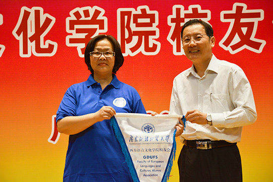 随后,在全体与会嘉宾的见证下,副校长方凡泉向校友会首任会长杨可院长授予广外伟德国际betvlctor1946校友会会旗。