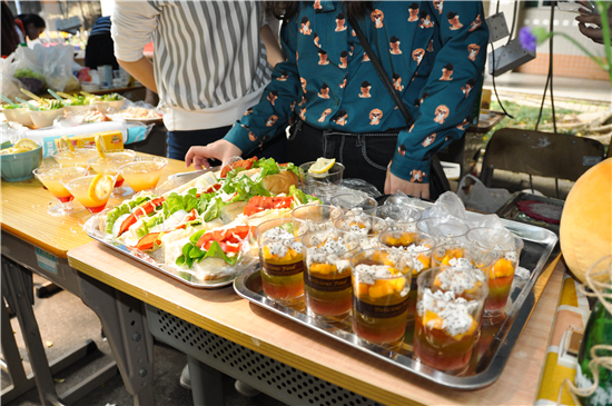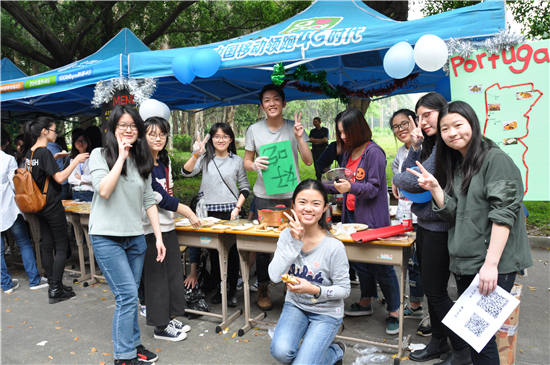 各语系美食摊位各具特色,如法语系的美味烘焙和鸡尾酒,意大利语系的意大利面和现磨咖啡,德语系的黑啤酒配红肠,西班牙语系的特调和土豆饼,俄语系的伏特和巧克力,葡萄牙语系的营养披萨和三文治,波兰语系的棉花糖……美味的食物散发诱人的香味,引发了各个学院师生和外国友人的驻足品尝。此外,还有外国友人助阵摊位,即兴弹奏音乐,各摊位成员倾情走动宣传美食,现场洋溢着欢乐和谐的气氛。
