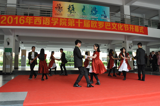 活动当天,晴朗明媚的天气与同学们的热情参与相得益彰。经典院舞《赛思莎》为开幕式掀开了帷幕,欢快洋气的欧式舞步踏出了欧罗巴大陆的优雅风情,赢得观众的阵阵掌声。随后,来自各语系同学用动听的小语种歌曲带领现场观众走进七国的音乐世界,体会各具特色的语言魅力。接着,院舞队精彩华丽的乡村舞也诠释了浪漫的欧式风味。最后由伟德国际betvlctor1946院长杨可教授为开幕式致词。随即主持人宣告开幕式表演结束,开幕式嘉年华正式开始。