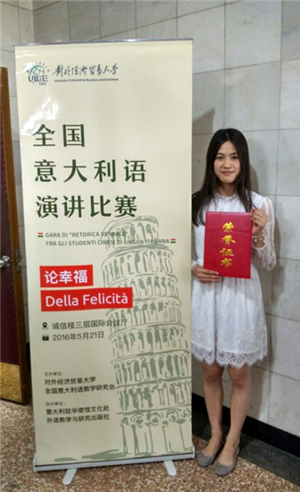 本网讯为进一步增进中意两国人民之间的友谊,加强相互了解,提高我国大学生的意大利语学习热情和意大利语学习水平,中国意大利语教学研究会于2016年5月21日举办第二届全国意大利语演讲大赛。经过学校校内严格选拔之后,伟德国际betvlctor1946麦颖贤同学被选中代表学校出战北京,并勇夺全国二等奖。