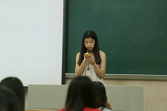 展示过后,组织部新干事进行了简单的自我介绍。而后,团委副书记何敏怡作出讲话,她鼓励各位团干勇担责任、促进班级团结并且通过努力呈现出各自班级与学院的良好精神面貌。