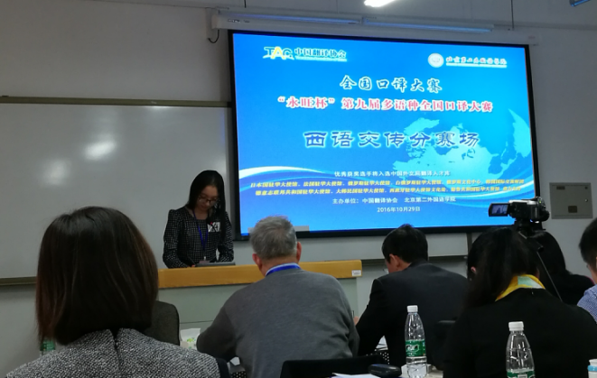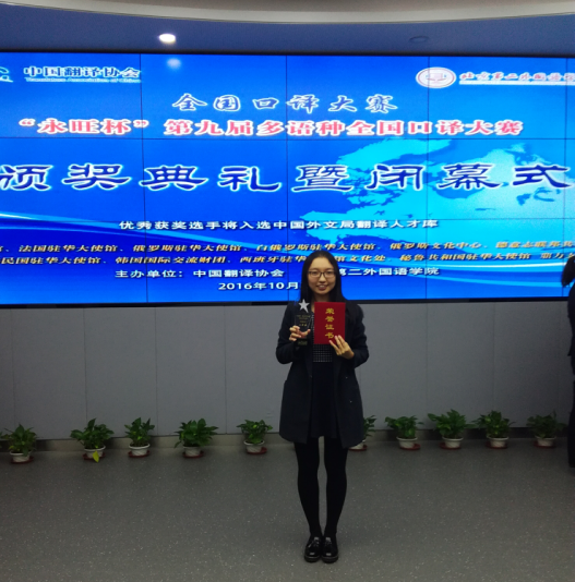 本网讯 2016年10月29日,“永旺杯”第九届全国多语种口译大赛在北京第二外国语学院拉开帷幕。本次大赛由中国翻译协会和北京第二外国语学院联合主办。今年参赛的高校达149所,设6个参赛语种,其中西班牙语交传首次作为比赛项目纳入该赛事。自今年6月份以来,西班牙语系2015级研究生方晓燕同学在陈星老师和吴凡老师的指导下积极备赛,先后通过全国初赛、复赛,最终闯入总决赛。此次比赛设一等奖一名、二等奖两名、三等奖三名。方晓燕同学凭借其扎实的语言基础和沉稳的临场发挥,最终决赛分数仅次于北外选手,荣获西语交传二等奖。