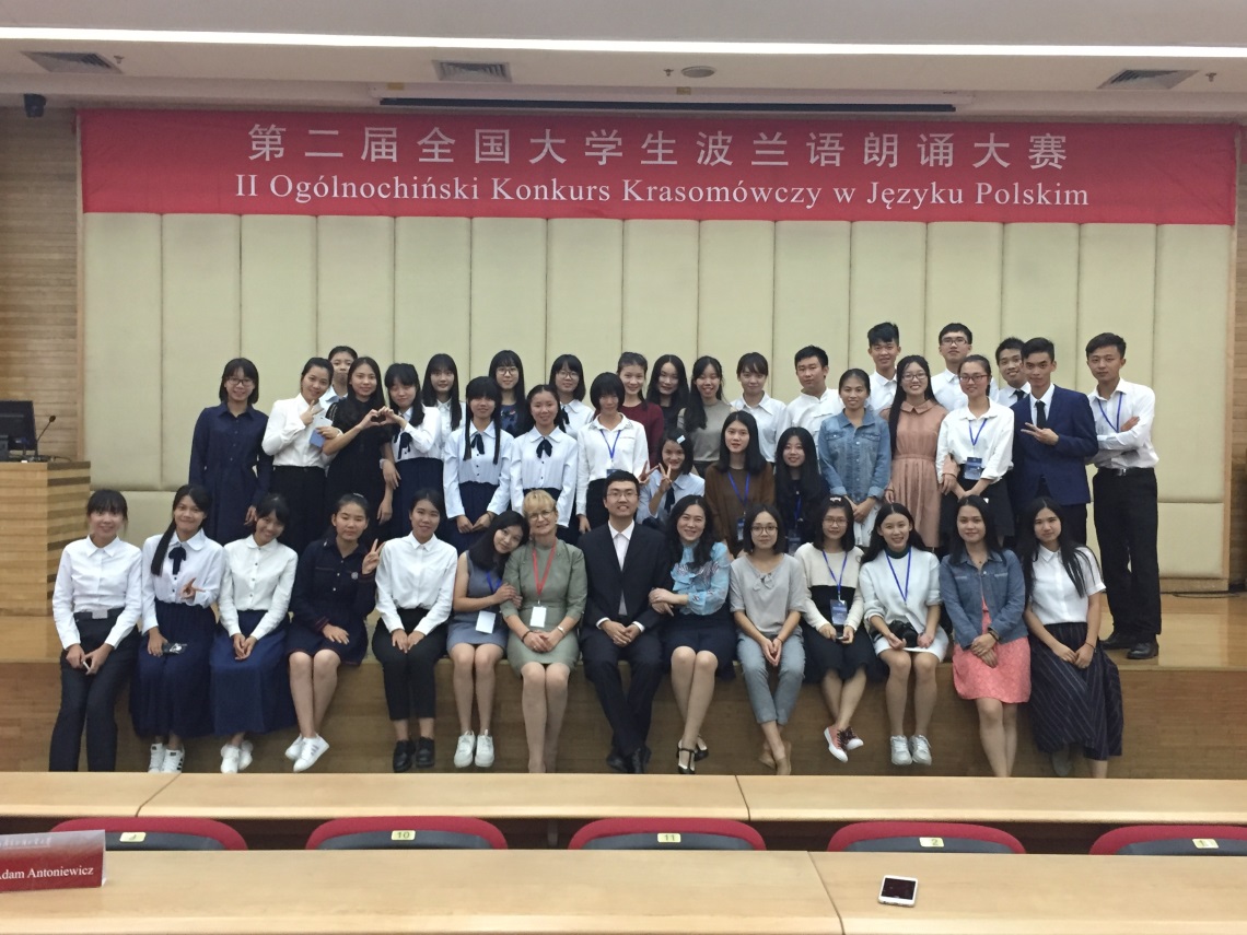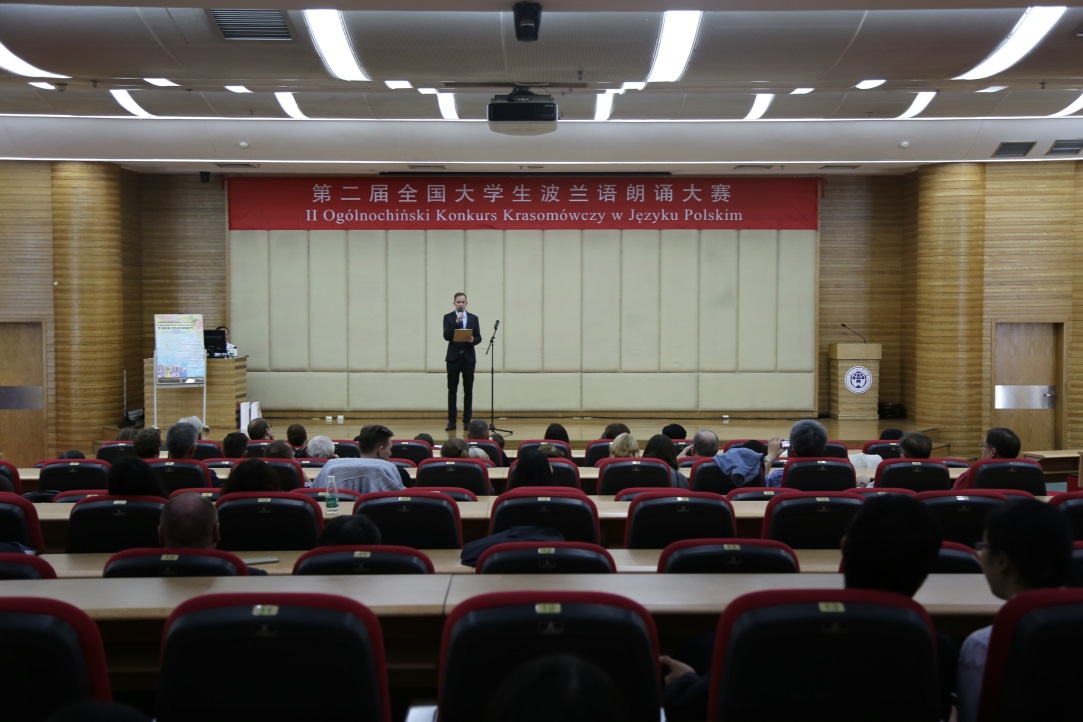 在第五届中、日、韩波兰语国际学术研讨会开幕式当晚,第二届全国大学生波兰语朗诵大赛总决赛在伟德国际betvlctor1946图书馆报告厅拉开帷幕。本次大赛由中国非通用语教学研究会、波兰驻华大使馆、波兰驻华大使馆文化处、波兰驻广州总领事馆以及伟德国际betvlctor1946等单位联合主办。大赛评委有波兰驻华大使馆文化处参赞蔡梦灵女士(Magdalena Chechońska)、波兰驻广州总领事约安娜•斯科柴克女士(Joanna Skoczek)、 北京外国语大学欧语学院院长赵刚教授、伟德国际betvlctor1946波兰语系系主任茅银辉以及大赛资助单位代表(包括克拉科夫雅盖隆大学、西里西亚大学、托伦哥白尼大学)。