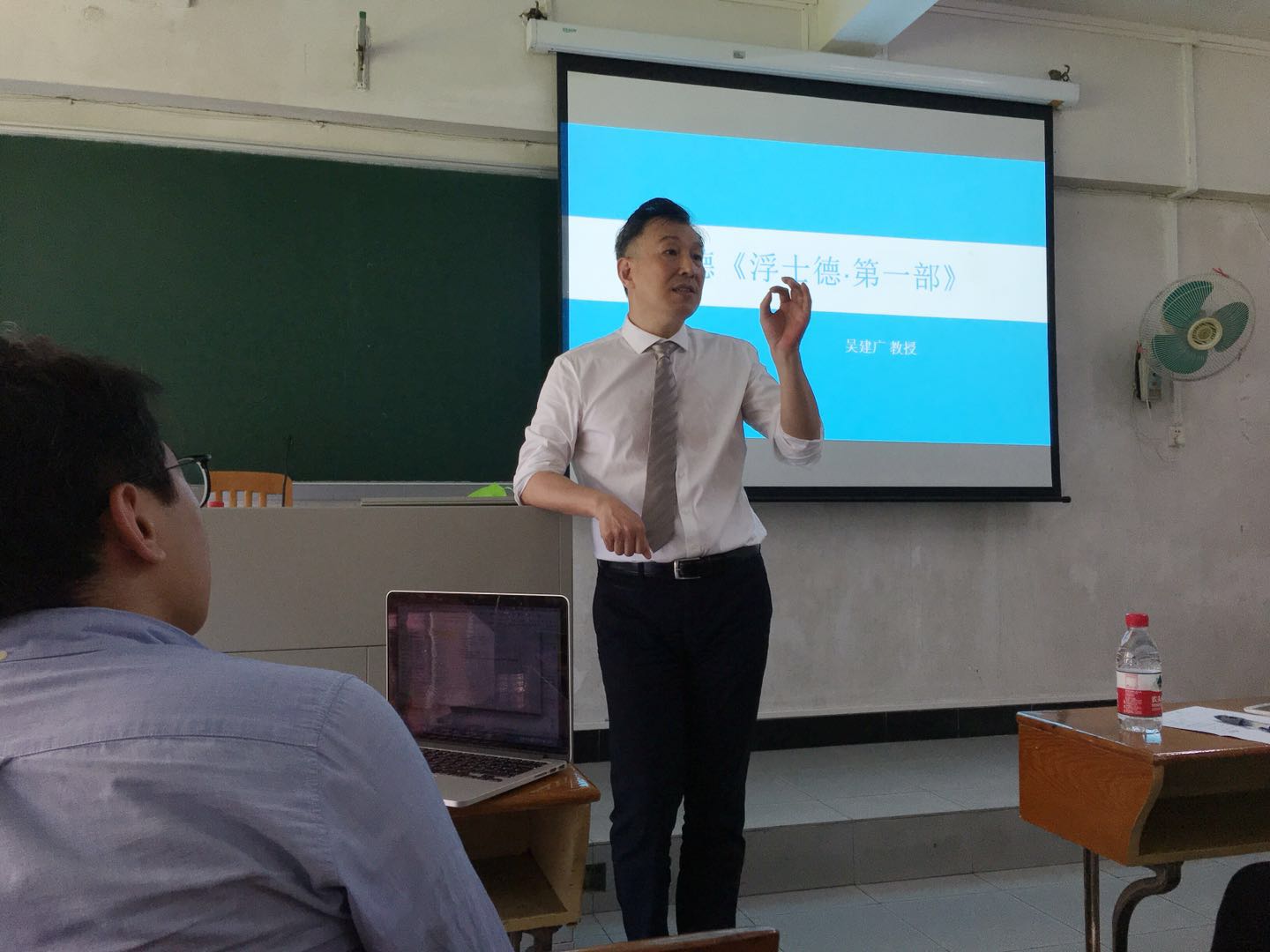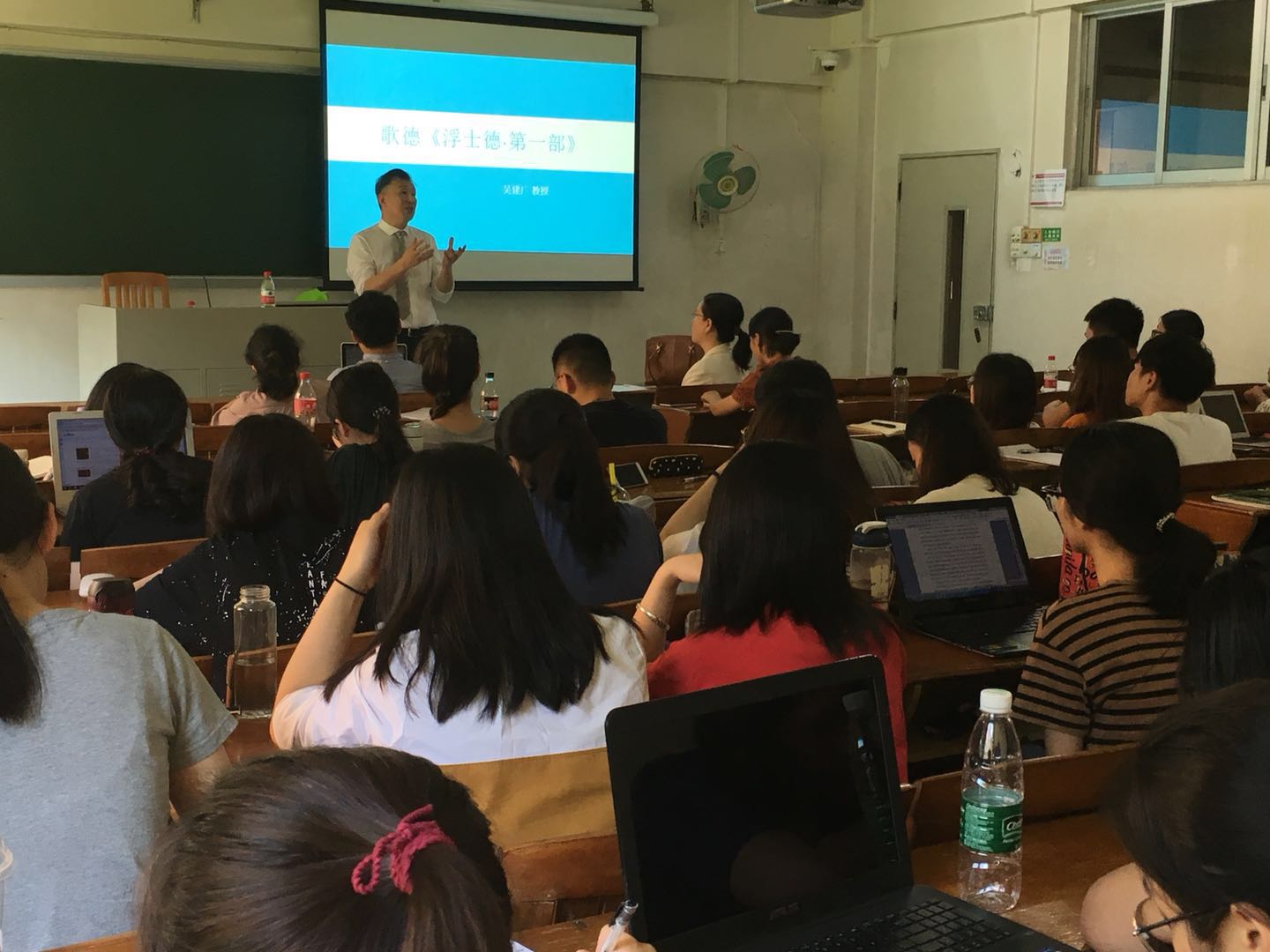 本网讯 2018年5月31日,研究生院“名师名课名讲坛”项目支持的系列讲座:歌德《浮士德·第一部》,邀请著名德语文学研究专家吴建广教授就德语经典作家歌德的代表作《浮士德·第一部》做了专题讲座。这次讲座吸引了德语系师生及其他学院师生前来旁听。
