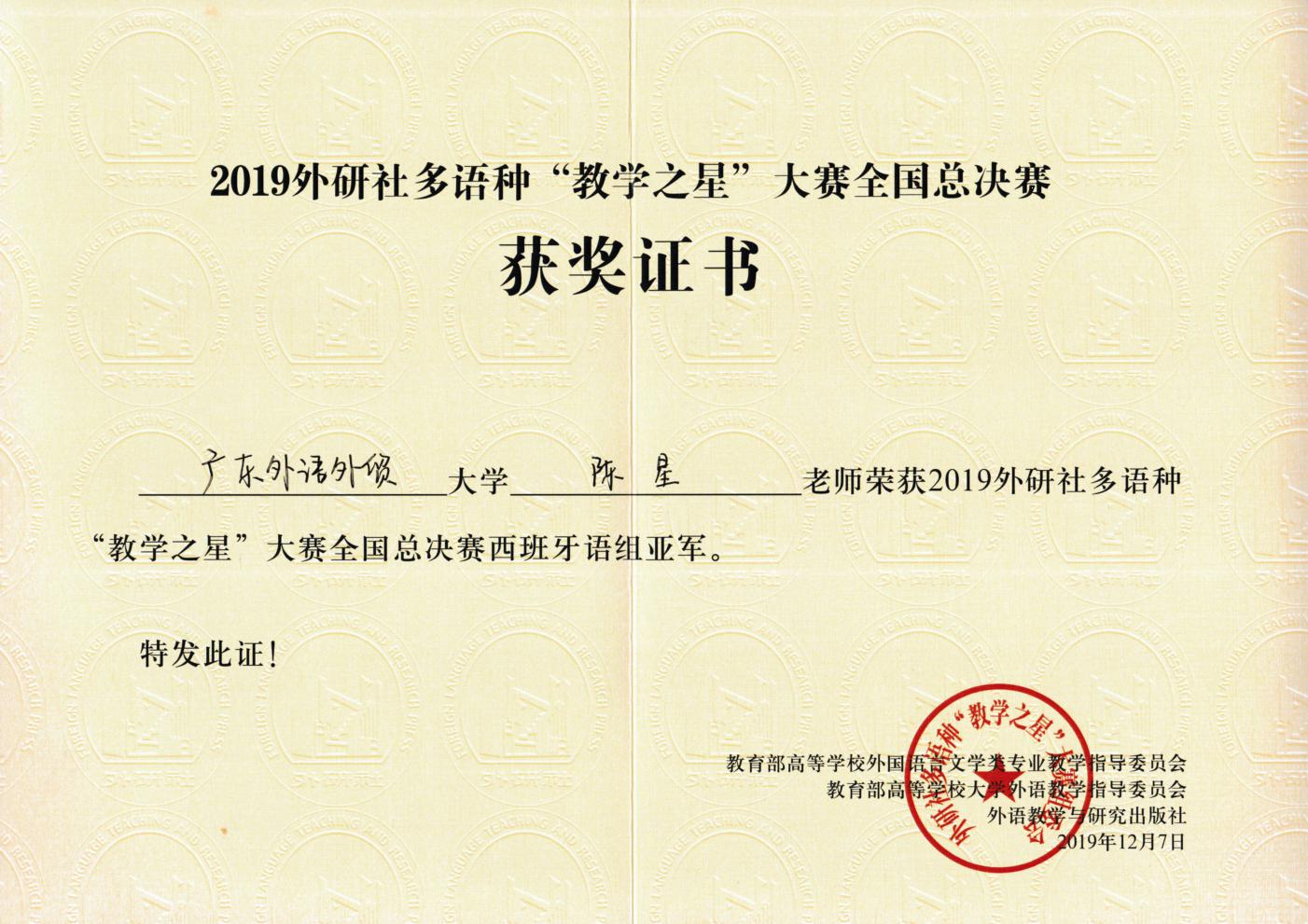 本网讯 12月7日由教育部高等学校外国语言文学类专业教学指导委员会、教育部高等学校大学外语教学指导委员会和外语及哦啊学与研究出版社共同举办的多语种“教学之星”大赛全国总决赛中伟德国际betvlctor1946教师陈星获得西班牙语组的亚军。该比赛是面向高校多语种教师开展的一项规模最大、语种最多的全国性多语种品牌赛事。