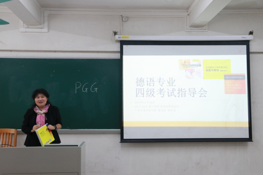 本次专题讲座由德语系的胡忠利老师负责主讲。讲座首先介绍了德语专业四级考试的重要性、全国德语专业四级考试情况,并详细地对考试注意事项、教纲以及考纲进行了讲解。其后胡老师通过分组讨论训练的方式,引领同学们详细分析和讨论了专四考卷的题型,介绍了德语学习以及具体为专四考试准备和练习的方法,并就同学们的易错点提出了针对性的目标与建议。