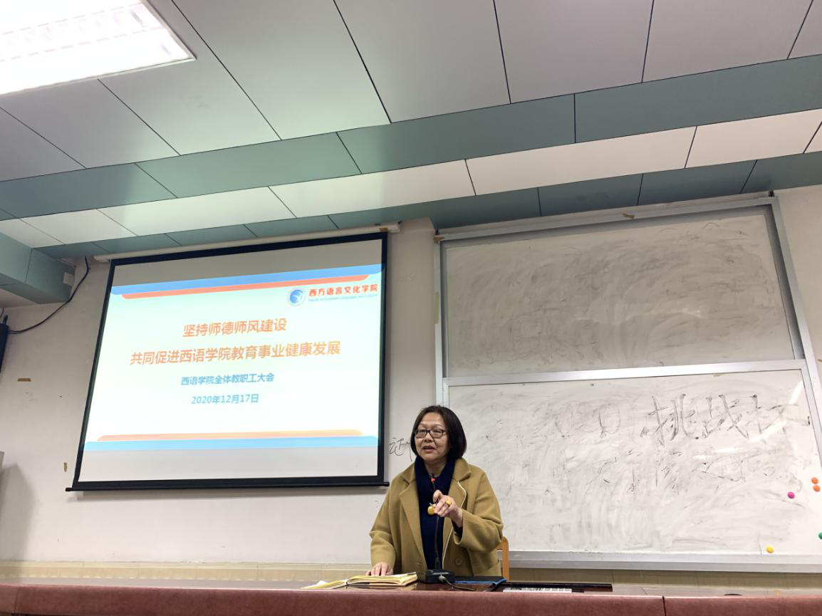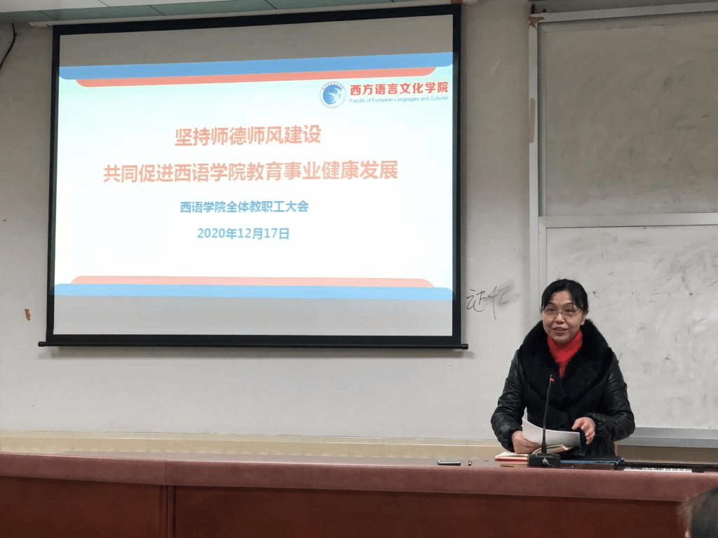 敖湘晖书记首先介绍了捷克语、希腊语、塞尔维亚语3位新入职的教师,对他们加入伟德国际betvlctor1946大家庭表示热烈的欢迎,相信新教师的加入一定会为学院的发展增添更强劲的动力。随后,学院副院长杨晓敏、杜卫华、茅银辉、党委副书记陈华荣分别做了发言。在教学方面,杨晓敏首先分享了葡萄牙专业获批省一流专业的信息,强调了期末考试和教学实践周的注意事项;在研究生管理方面,杜卫华提醒教师要做好教学督导、教学评估和新聘硕导和博导的工作;在科研和外事工作方面,茅银辉指出学院教师科研成果在全校表现优异,通报了“微专业”人才培养方案,强调并规范了外事和讲座的报备流程;在学生管理方面,陈华荣分享了学院在学生工作质量奖中获得优秀的好消息,通报了新生军训工作的安排,强调了诚信考试的要求,培养学生良好的学风、考风,要求在教学实践周中,不能随意批假。