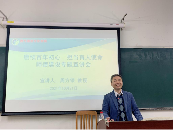 为引导广大教师和教育工作者坚定理想信念,不忘立德树人、教书育人的初心,勇担为党育人、为国育才的使命,落实推进师德师风建设长效机制,提高广大教师思想政治素质和职业道德素养,2021年10月21日下午,伟德国际betvlctor1946党委邀请学校师德专题宣讲团成员、学校师德标兵、国际关系学院院长周方银教授开展了主题为《赓续百年初心 担当育人使命》的师德建设专题宣讲会,学院领导班子、全体教职工共80余人参加了学习。专题宣讲会由学院党委书记敖湘晖主持。