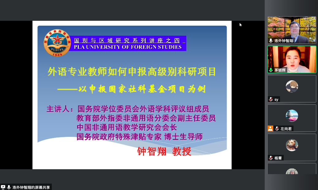 通过引领学习已经立项的外国文学项目的成功经验,钟教授具体讲解如何设计适合自己的研究选题,其中强调了选题的前期积累和选题的时代感。对于外语专业老师,钟教授强调不用拘泥于外国文学和语言学,对象国家相关的领域都可以作为申报考虑范围。钟教授特别讲到了中华学术外译项目,作为当前一个热门的领域,强调外语类教师在中华学术外译项目上的优势。