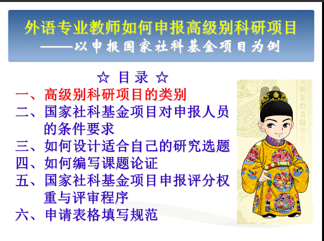 钟教授从高级别科研项目类别、国家社科基金项目对申报人员的条件要求、如何设计适合自己的研究选题、如何编写课题论证、国家社科基金项目申报评分权重与评审程序以及申请表格填写规范等六个方面,结合自身作为科研项目申报人和评审者的经历对各个申报环节做深入浅出的分析,为申报教师提供了明确具体的指导意见和切实有效的申报建议。