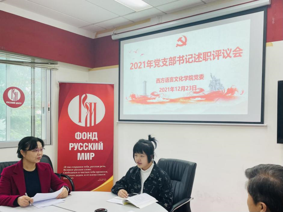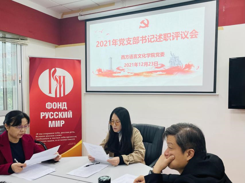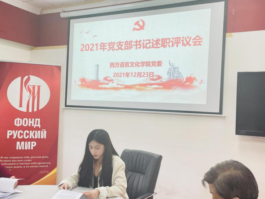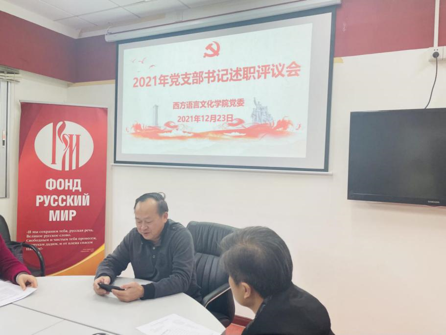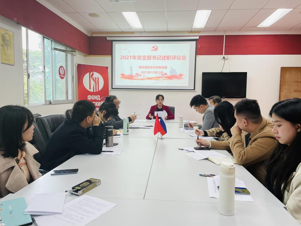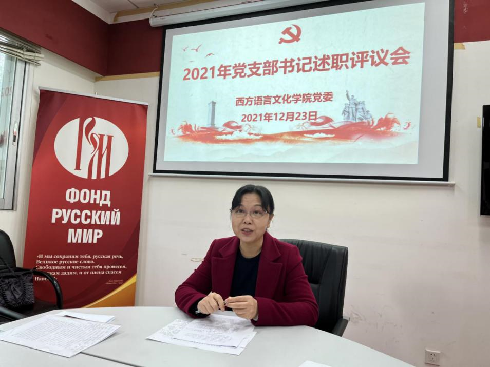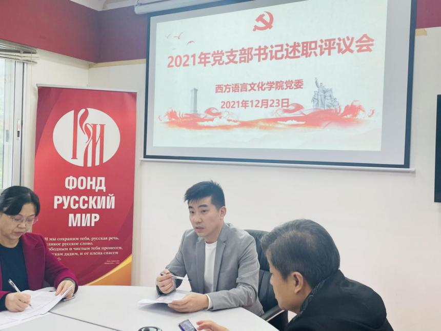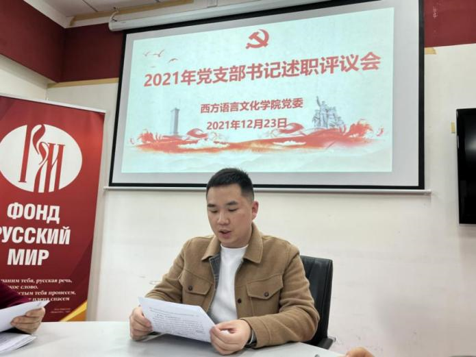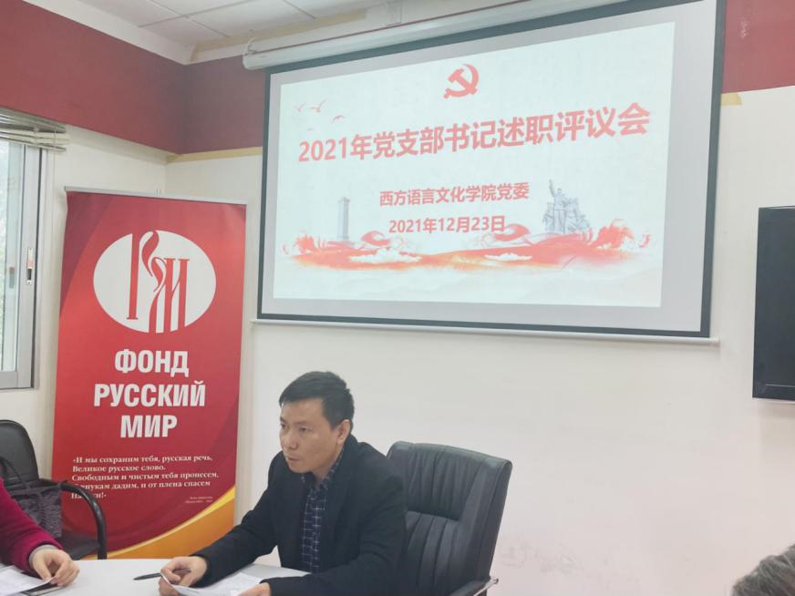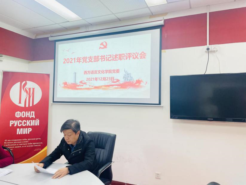 2021年12月23日下午,伟德国际betvlctor1946党委在俄语中心召开师生党支部书记述职评议会议,会议由学院党委书记敖湘晖主持。各党支部按照教工第一党支部、教工第二党支部、教工第三党支部、法语本科学生党支部、德语本科学生党支部、西语本科学生党支部、俄语本科学生党支部、非通用语本科学生党支部、法俄研究生联合党支部、德西研究生联合党支部的顺序依次进行述职。
