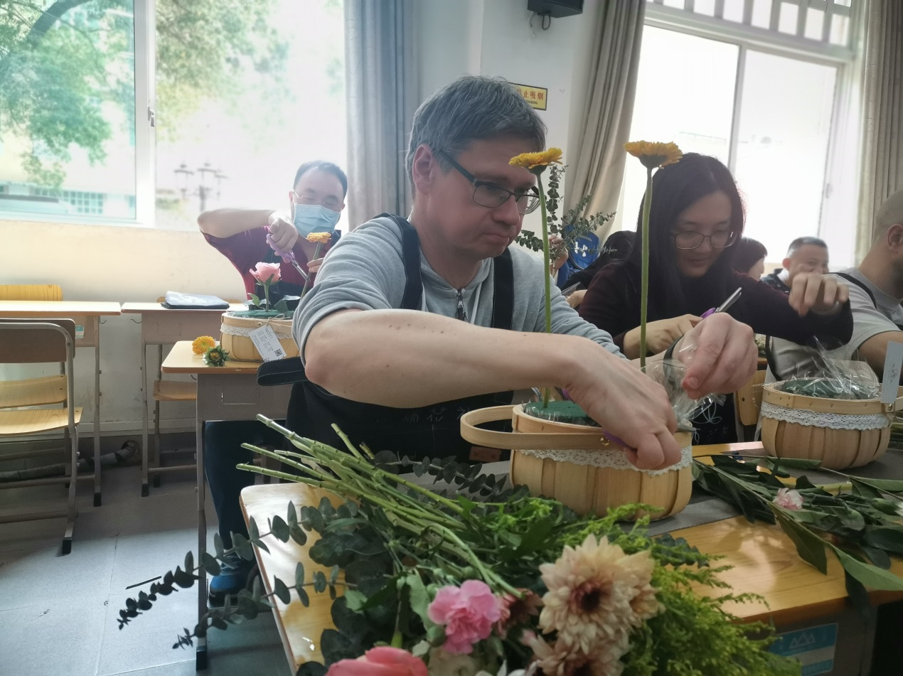座谈会后,外籍教师参加了学院工会组织的插花活动。在花艺师介绍花材、讲解基本的花艺知识并进行剪裁示范之后,在座的外籍教师兴致盎然、跃跃欲试。