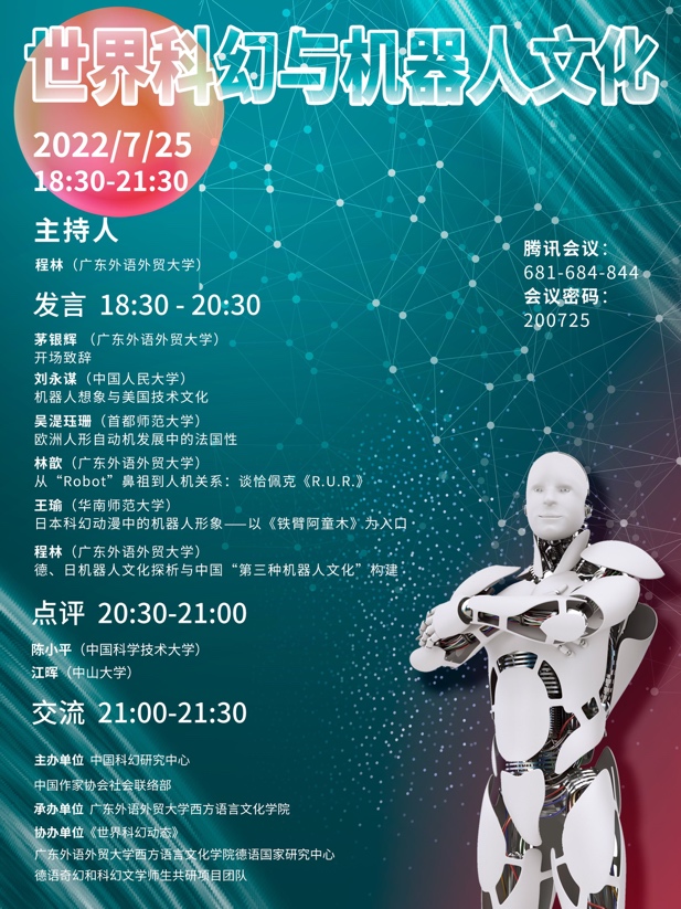 本网讯 2022年7月25日晚,“世界科幻与机器人文化”沙龙在线上举办。本次沙龙由中国科幻研究中心和中国作家协会社会联络部主办,伟德国际betvlctor1946,伟德bv1946官方网站承办,《世界科幻动态》、伟德国际betvlctor1946,伟德bv1946官方网站德语国家研究中心、德语奇幻和科幻文学师生共研项目团队协办,是中国科幻研究中心2022年度“科幻沙龙研习季”的“收官之战”。沙龙就机器人和科幻等前沿话题进行了深入探讨,尽管是在暑假期间举办,但仍吸引了来自中国人民大学、中山大学、中国科学技术大学、首都师范大学、华南师范大学等高校近两百名师生参与交流。